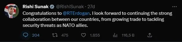 İngiltere Başbakanı Sunak, Twitter hesabından yaptığı paylaşımda, Başkan Erdoğan'ı tebrik etti.