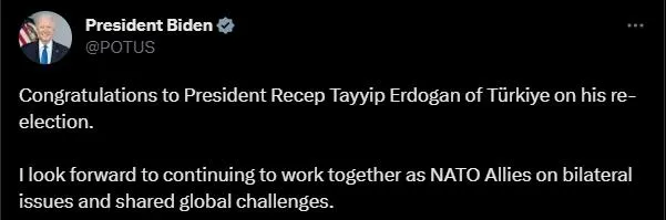 Biden, Twitter'dan yaptığı paylaşımda, "Türkiye Cumhurbaşkanı Recep Tayyip Erdoğan'ı yeniden seçilmesi vesilesiyle kutluyorum. NATO müttefikleri olarak ikili meseleler ve ortak küresel zorluklar üzerinde birlikte çalışmaya devam etmeyi dört gözle bekliyorum." ifadesine yer verdi.