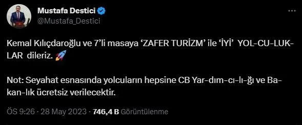 Cumhur İttifakı'nın hiçbir pazarlık olmadan, Türkiye sevdasıyla çalıştığını dile getiren Destici, "Neticede çalışan, samimi olan kazanmıştır. Pazarlık içinde olanlar kaybetmiştir. Onlara da başta Kemal Kılıçdaroğlu ve 7'li masaya da Zafer turizm ile Kandil'e hayırlı yolculuklar diliyoruz." dedi.