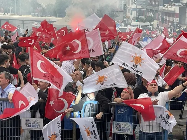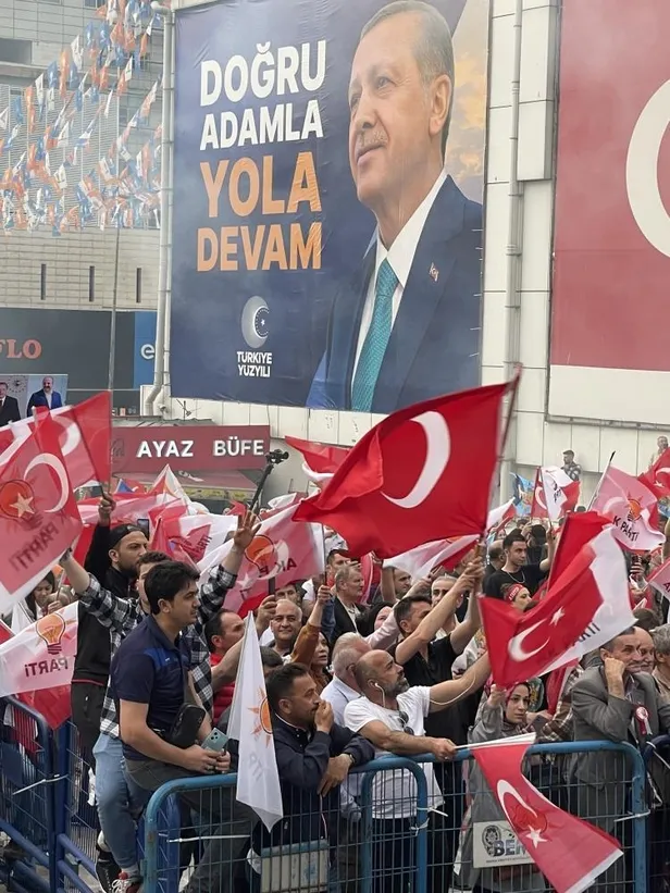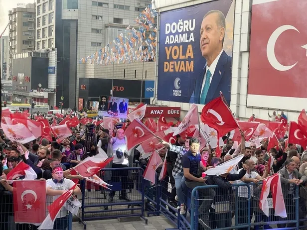 Erdoğan'ın devasa fotoğrafının yer aldığı meydanda zafer şarkıları, kahramanlık türküleri ve seçim şarkıları söyleniyor.