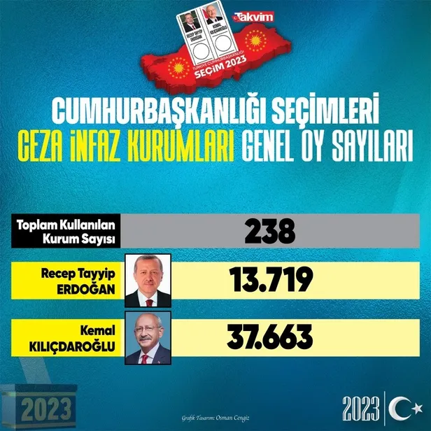 Toplam 5 bin 96 oyun kullanıldığı Silivri Cezaevi'nde, Kılıçdaroğlu 3 bin 814 oy alırken, Cumhurbaşkanı Recep Tayyip Erdoğan'a bin 282 oy çıktı. Toplam 2 bin 381 oyun kullanıldığı Diyarbakır Ceza İnfaz Kurumu Kampüsü'nde ise Erdoğan'a 221 verilirken, Kılıçdaroğlu'na tam 2 bin 160 oy çıktı. Diyarbakır 1 Nolu T Tipi Kapalı'da 570 oyun 532'si CHP lideri Kılıçdaroğlu'na verildi. Diyarbakır Kadın Kapalı'da da 135 oyun 114'ü Kemal Kılıçdaroğlu'na çıktı.