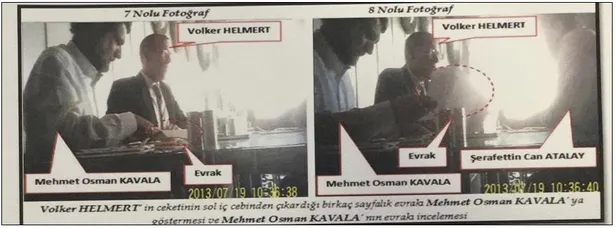 Soruşturmada; Osman Kavala'nın; 16 Temmuz 2013 tarihinde Şerafettin Can Atalay'ı arayarak Almanya İstanbul Başkonsolosluğu Hukuk, Basın ve Vize Bölümü Direktörü Dr. Volker Helmert'in kendisi ile görüşmek istediğinin tespit edildiğine dikkat çekildi. Soruşturma kapsamında; Osman Kavala, Şerafettin Can Atalay ve Volker Helmert'in; 19 Temmuz 2013 tarihinde saat:09.45 sıralarında Beyoğlu Taksim Sıraselviler Caddesi No:9 sayılı adreste bulunan Taxim Oda Cafe'de buluştukları tespit edildi.