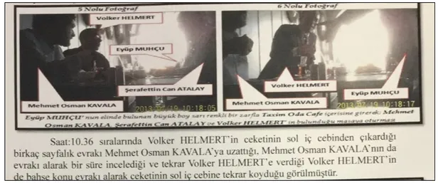 Volker Helmert'in; Osman Kavala ve Şerafettin Can Atalay'ın bulunduğu masaya doğru ilerleyerek söz konusu kişilerle tokalaştığı ve masaya oturduğu, şahısların aralarında genellikle İngilizce konuştuğu, zaman zaman da Osman Kavala ve Can Atalay'ın Türkçe anlatacakları konuyu tartıştıkları tespit edildi.