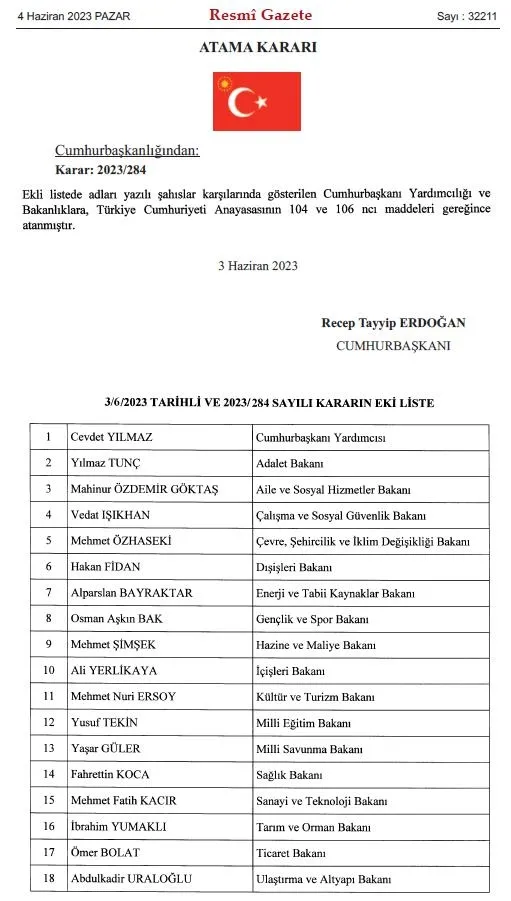 Yeni kabineye ilişkin atama kararı Başkan Recep Tayyip Erdoğan'ın imzasıyla Resmi Gazete'de yayımlanarak yürürlüğe girdi.