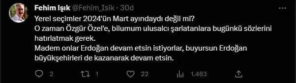 Ardından attığı tweetle CHP'lilere şarlatan diyen Işık, "Yerel seçimler 2024'ün Mart ayındaydı değil mi? O zaman Özgür Özel'e, bilumum ulusalcı şarlatanlara bugünkü sözlerini hatırlatmak gerek. Madem onlar Erdoğan devam etsin istiyorlar, buyursun Erdoğan büyükşehirleri de kazanarak devam etsin." diyerek adeta rest çekti.