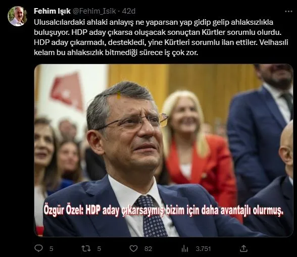 Işık, yazdığı yazının arkasından sosyal medyadan yaptığı açıklamalarla da CHP'yi de hedef aldı. Kılıçdaroğlu ile koltuk kavgasına tutuşan CHP'lilere ve Özgür Özel'in "HDP aday çıkarsaymış bizim için daha avantajlı olurmuş" açıklamasına zehir zemberek sözlerle sert tepki gösteren Işık, "Ulusalcılardaki ahlaki anlayış ne yaparsan yap gidip gelip ahlaksızlıkla buluşuyor. HDP aday çıkarsa oluşacak sonuçtan Kürtler sorumlu olurdu. HDP aday çıkarmadı, destekledi, yine Kürtleri sorumlu ilan ettiler. Velhasıli kelam bu ahlaksızlık bitmediği sürece iş çok zor." dedi.