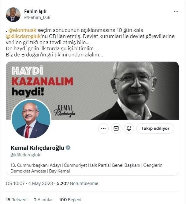 Seçimlerden önce PKK medyası aktörlerinden Fehim Işık, "Kılıçdaroğlu'na destek verelim" çağrısı yapmıştı. Işık, "Elon Musk, seçim sonucunun açıklanmasına 10 gün kala Kılıçdaroğlu'nu CB ilan etmiş. Devlet kurumları ile devlet görevlilerine verilen gri tık'ı ona tevdi etmiş bile... De haydi gelin ilk turda şu işi bitirelim... Biz de Erdoğan'ın gri tık'ını ondan alalım..." ifadelerini kullanmıştı.