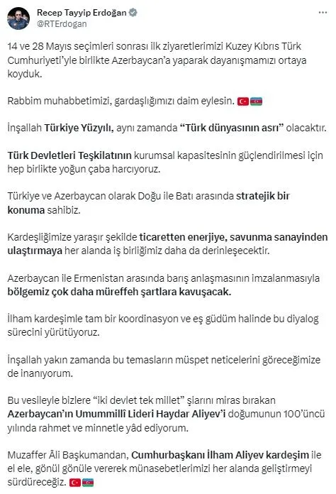 Başkan Recep Tayyip Erdoğan Azerbaycan gezisinden sonra resmi sosyal medyasından açıklama yaptı: