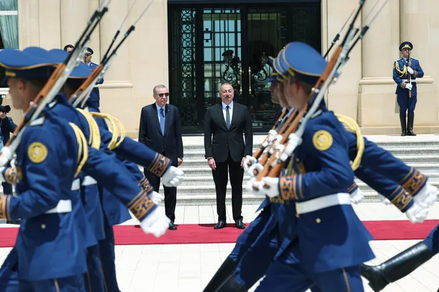 Mevkidaşı Aliyev ile tören kıtasını denetleyen Erdoğan, askerleri selamladı.