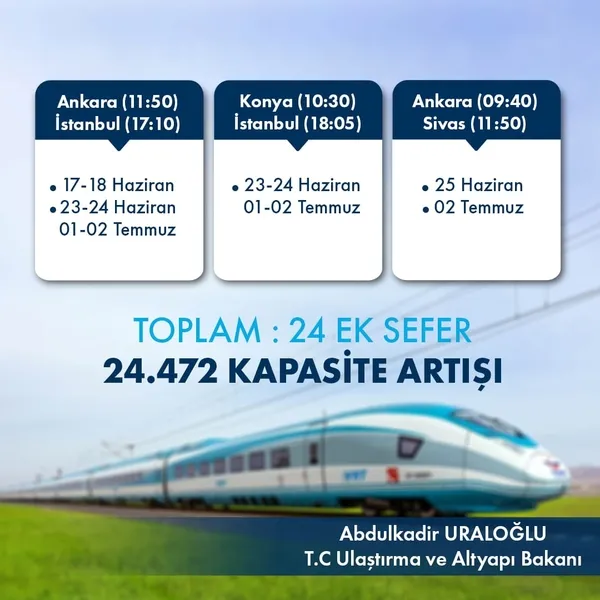 "Ankara-İstanbul, Konya-İstanbul ve Ankara-Sivas arasında toplam 24 ek hızlı tren seferi düzenliyoruz. Ankara-İstanbul arasında 17-18, 23-24 Haziran, 1-2 Temmuz, Konya-İstanbul arasında 24-25 Haziran ve 1-2 Temmuz, Ankara-Sivas arasında ise 25 Haziran ve 2 Temmuz tarihlerinde işletilecek ilave hızlı tren seferiyle 10 bin 152 kişilik ilave kapasite sağlamış olacağız."