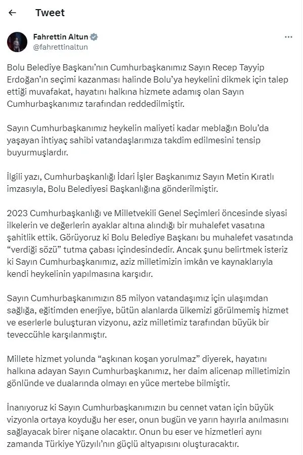 "Bolu Belediye Başkanı'nın Cumhurbaşkanımız Sayın Recep Tayyip Erdoğan'ın seçimi kazanması halinde Bolu'ya heykelini dikmek için talep ettiği muvafakat, hayatını halkına hizmete adamış olan Sayın Cumhurbaşkanımız tarafından reddedilmiştir. Sayın Cumhurbaşkanımız heykelin maliyeti kadar meblağın Bolu'da yaşayan ihtiyaç sahibi vatandaşlarımıza takdim edilmesini tensip buyurmuşlardır. İlgili yazı, Cumhurbaşkanlığı İdari İşler Başkanımız Sayın Metin Kıratlı imzasıyla, Bolu Belediyesi Başkanlığına gönderilmiştir. 2023 Cumhurbaşkanlığı ve Milletvekili Genel Seçimleri öncesinde siyasi ilkelerin ve değerlerin ayaklar altına alındığı bir muhalefet vasatına şahitlik ettik. Görüyoruz ki Bolu Belediye Başkanı bu muhalefet vasatında "verdiği sözü" tutma çabası içindesindedir. Ancak şunu belirtmek isteriz ki Sayın Cumhurbaşkanımız, aziz milletimizin imkân ve kaynaklarıyla kendi heykelinin yapılmasına karşıdır.