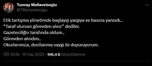 Konuyla ilgili konuşan Mollaveisoğlu, "Etik tartışma yönetimde başlayıp yargıya ve basına yansıdı… "Taraf olursan görevden alırız" dediler. Gazeteciliğin tarafında oldum.. Görevden alındım.. Okurlarımıza, dostlarıma saygı ile duyuruyorum." ifadelerini kullandı.