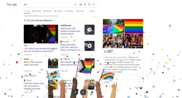 Teknoloji devi Twiter'ın aksine Google, sapkın LGBT'yi destekliyor ve sayfasında adeta festival gibi kutluyor. Google aramasına "LGBT" yazıldığı anda adeta sözde onu ayını kutlamak için rengarenk konfetiler patlatılıyor.