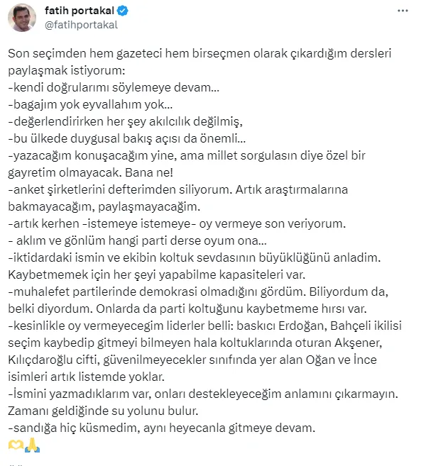 Seçimlerin ardından kendisine yeni dersler çıkardığını ifade eden Fatih Portakal, bugün sosyal medyadan yeni açıklamalar yaptı. Portakal, ilk olarak "Son seçimden hem gazeteci hem bir seçmen olarak çıkardığım dersleri paylaşmak istiyorum: Kendi doğrularımı söylemeye devam… Bagajım yok eyvallahım yok… Değerlendirirken her şey akılcılık değilmiş, bu ülkede duygusal bakış açısı da önemli… Yazacağım konuşacağım yine, ama millet sorgulasın diye özel bir gayretim olmayacak. Bana ne! Anket şirketlerini defterimden siliyorum. Artık araştırmalarına bakmayacağım, paylaşmayacağım" ifadelerini kullandı.