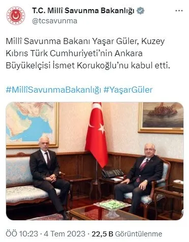 Son dakika: Milli Savunma Bakanı Yaşar Güler, KKTC Ankara Büyükelçisi İsmet Korukoğlu'nu kabul etti