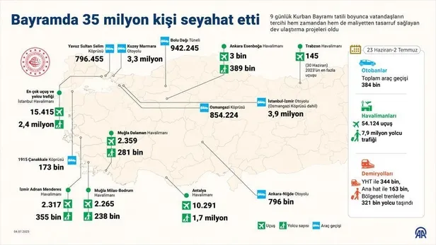 Ulaştırma ve Altyapı Bakanlığı, 23 Haziran-2 Temmuz 2023 tarihleri arasında (10 günlük) tatil süresince hava, kara ve demiryolu ulaşımında yaşanan istatistiki bilgileri paylaştı:
