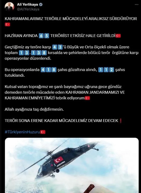 Bakan Yerlikaya, Twitter hesabından yaptığı açıklamada, "Kahramanlarımız terörle mücadeleyi aralıksız sürdürüyor. Haziran ayında 65 terörist etkisiz hale getirildi. Geçtiğimiz ay teröre karşı 43'ü büyük ve orta ölçekli olmak üzere toplam 13 bin 138 kırsalda ve şehirlerde bölücü terör örgütüne karşı operasyonlar düzenlendi.