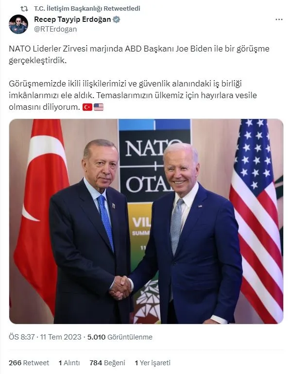 Söz konusu açıklamada, Başkan Erdoğan ve ABD Başkaı Joe Biden'ın fotoğrafına yer verildi ve "NATO Devlet ve Hükûmet Başkanları Zirvesi nedeniyle Litvanya'nın başkenti Vilnius'ta bulunan Cumhurbaşkanımız Recep Tayyip Erdoğan, Amerika Birleşik Devletleri (ABD) Başkanı Joe Biden ile bir araya geldi" denildi.