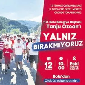 Ankara'ya yürüyüş başlatan Bolu Belediye Başkanı Tanju Özcan, kendisine destek verenleri bugün saat 17.00'de CHP Genel Merkezi önünde beklediğini açıkladı.