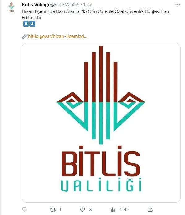 Bitlis Valiliği, Hizan'da bulunan bazı bölgelerin terör örgütü mensuplarının faaliyetini engellemek, eylem etkinliğini kırmak maksadıyla icra edilebilecek operasyonlar kapsamında 15 gün süreyle özel güvenlik bölgesi olarak ilan edildiğini duyurdu.
