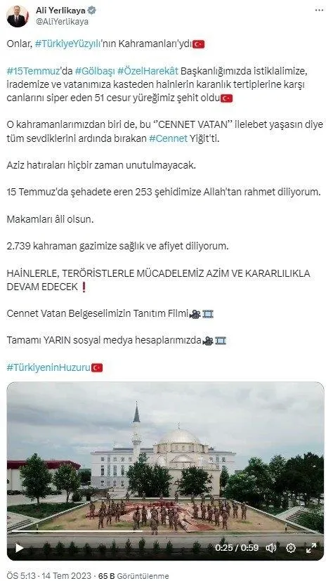 "O kahramanlarımızdan biri de, bu 'Cennet Vatan' ilelebet yaşasın diye tüm sevdiklerini ardında bırakan Cennet Yiğit'ti. Aziz hatıraları hiçbir zaman unutulmayacak. 15 Temmuz'da şehadete eren 253 şehidimize Allah'tan rahmet diliyorum.