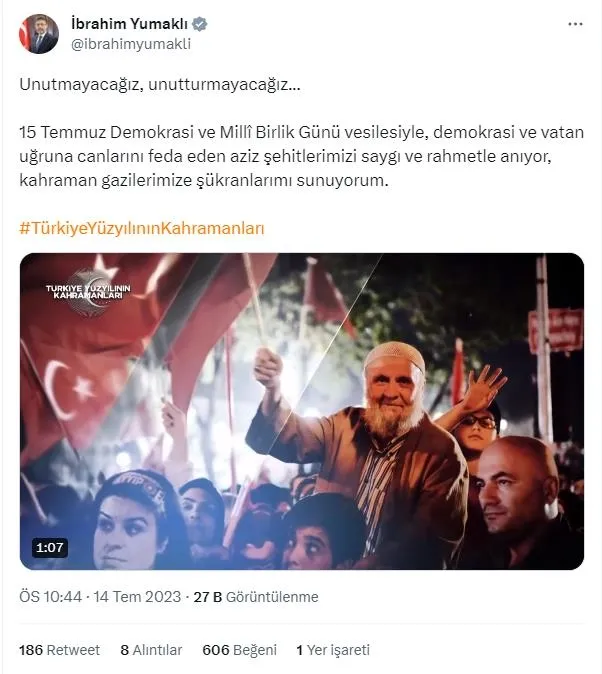 "Hain terör örgütü FETÖ tarafından yapılan kanlı darbe girişiminin Cumhurbaşkanımız Sayın Recep Tayyip Erdoğan'ın kararlı duruşu ve aziz milletimizin onurlu mücadelesiyle engellendiği 15 Temmuz, şanlı tarihimize yazılan yeni bir kahramanlık destanı ve hıyanet şebekesinin hezimet günü olarak tarihe geçmiştir. Türkiye Yüzyılı'nın kahramanları müsterih olsun, canınız pahasına koruduğunuz emanetiniz emin ellerde. Aziz şehitlerimize rahmet, gazilerimize esenlikler diliyorum. Vatan size minnettardır. Unutmadık, unutturmayacağız. Türkiye geçilmez."