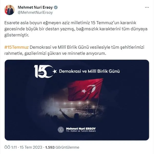 Kültür ve Turizm Bakanı Mehmet Nuri Ersoy, "Esarete asla boyun eğmeyen aziz milletimiz 15 Temmuz'un karanlık gecesinde büyük bir destan yazmış, bağımsızlık karakterini tüm dünyaya göstermiştir. 15 Temmuz Demokrasi ve Millî Birlik Günü vesilesiyle tüm şehitlerimizi rahmetle, gazilerimizi şükran ve minnetle anıyorum" dedi.