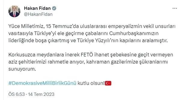 Twitter hesabından paylaşımda bulunan Dışişleri Bakanı Hakan Fidan ise, "Yüce Milletimiz, 15 Temmuz'da uluslararası emperyalizmin vekil unsurları vasıtasıyla Türkiye'yi ele geçirme çabalarını Cumhurbaşkanımızın liderliğinde boşa çıkartmış ve Türkiye Yüzyılı'nın kapılarını aralamıştır" ifadelerini kullandı.