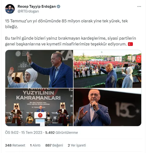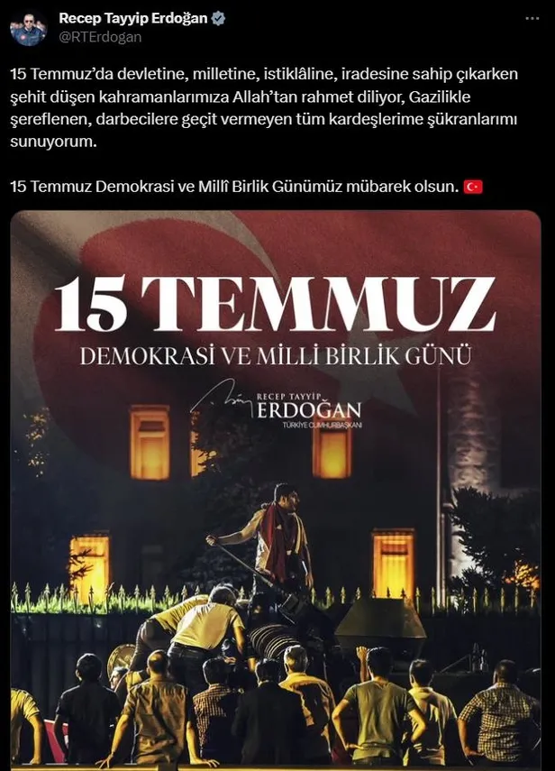 Erdoğan, paylaşımında, "15 Temmuz'da devletine, milletine, istiklaline, iradesine sahip çıkarken şehit düşen kahramanlarımıza Allah'tan rahmet diliyor, gazilikle şereflenen, darbecilere geçit vermeyen tüm kardeşlerime şükranlarımı sunuyorum. 15 Temmuz Demokrasi ve Milli Birlik Günümüz mübarek olsun." ifadelerini kullandı.
