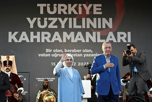 Cumhurbaşkanlığı İletişim Başkanlığının hazırladığı tanıtım filminin izlenmesinin ardından eşi Emine Erdoğan ile kürsüye çıkan Cumhurbaşkanı Erdoğan, kalabalığı selamladı.