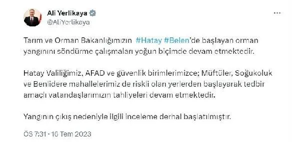 Yerlikaya, "Tarım ve Orman Bakanlığımızın Hatay Belen'de başlayan orman yangınını söndürme çalışmaları yoğun biçimde devam etmektedir. Hatay Valiliğimiz, AFAD ve güvenlik birimlerimizce; Müftüler, Soğukoluk ve Benlidere mahallelerimizde riskli olan yerlerden başlayarak tedbir amaçlı vatandaşlarımızın tahliyeleri devam etmektedir. Yangının çıkış nedeniyle ilgili inceleme derhal başlatılmıştır" dedi.