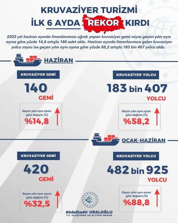 Ulaştırma ve Altyapı Bakanı Uraloğlu, Türkiye limanlarına demir atan kruvaziyer gemi ve yolcu sayısında geçen yılın ilk 6 ayına göre rekor kırıldığını açıkladı.