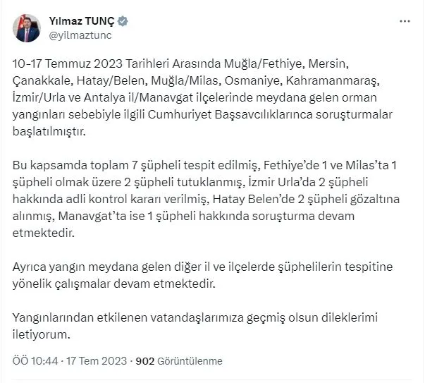 "10-17 Temmuz 2023 Tarihleri Arasında Muğla/Fethiye, Mersin, Çanakkale, Hatay/Belen, Muğla/Milas, Osmaniye, Kahramanmaraş, İzmir/Urla ve Antalya il/Manavgat ilçelerinde meydana gelen orman yangınları sebebiyle ilgili Cumhuriyet Başsavcılıklarınca soruşturmalar başlatılmıştır. Bu kapsamda toplam 7 şüpheli tespit edilmiş, Fethiye'de 1 ve Milas'ta 1 şüpheli olmak üzere 2 şüpheli tutuklanmış, İzmir Urla'da 2 şüpheli hakkında adli kontrol kararı verilmiş, Hatay Belen'de 2 şüpheli gözaltına alınmış, Manavgat'ta ise 1 şüpheli hakkında soruşturma devam etmektedir. Ayrıca yangın meydana gelen diğer il ve ilçelerde şüphelilerin tespitine yönelik çalışmalar devam etmektedir. Yangınlarından etkilenen vatandaşlarımıza geçmiş olsun dileklerimi iletiyorum."