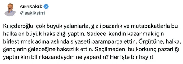 Kılıçdaroğlu'nun siyaseti paramparça ettiğini vurgulayan Sakık, şu notu düştü;