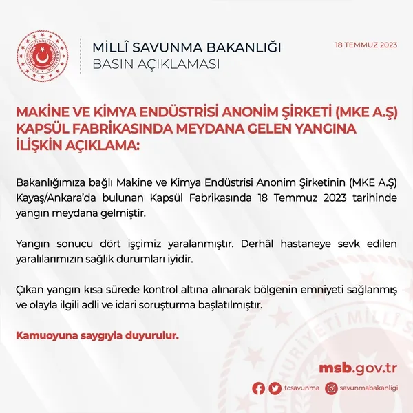 Milli Savunma Bakanlığı'ndan yapılan açıklamada "Bakanlığımıza bağlı Makine ve Kimya Endüstrisi Anonim Şirketinin Kayaş/Ankara'da bulunan Kapsül Fabrikasında 18 Temmuz 2023 tarihinde yangın meydana gelmiştir. Yangın sonucu 4 işçimiz yaralanmıştır. Derhal hastaneye sevk edilen yaralılarımızın sağlık durumları iyidir. Çıkan yangın kısa sürede kontrol altına alınarak bölgenin emniyeti sağlanmış ve olayla ilgili idari ve adli soruşturma başlatılmıştır" denildi.