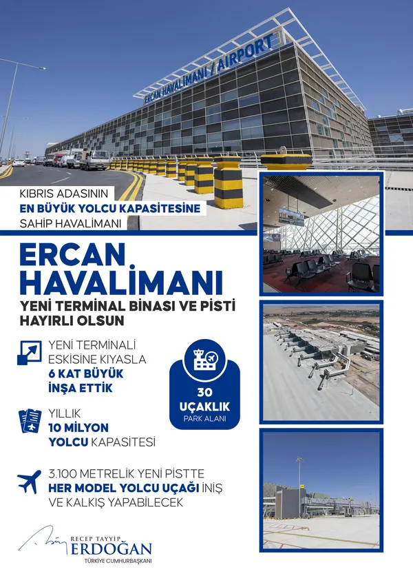 Sivil hava trafiğine 3 Şubat 1975'te açılan Ercan Havalimanı'nın daha önce 20 bin metrekarelik terminal binası, 34 bin metrekarelik otopark alanı ve 2 bin 755 metre uzunluğunda ana piste sahip olduğunu belirten Erdoğan, 2016'da başlanan inşa faaliyetleriyle havalimanının geniş gövdeli uçaklara da ev sahipliği yapma kapasitesine kavuşturulduğunu bildirdi.