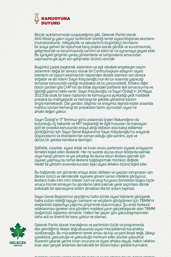 Gelecek Partisi Genel Merkezi gizli protokol ile Kemal Kılıçdaroğlu'nu bombalayan bir açıklama yaptı. Açıklamada "Bilgimiz ve onayımız dışında kişiler arasında mahfuz tutulan herhangi bir protokolün bizim açımızdan siyasi ve ahlaki değeri yoktur. Şeffaflık, tutarlılık, siyasi ahlak ve insan onuru partimizin siyaset anlayışının temelini teşkil eden ilkelerdir. Her ne surette olursa olsun iktidarda kalmak veya hangi yöntem ve yol arkadaşı ile olursa olsun iktidara gelmek için siyaset yapmayı bu temel ilkelerle bağdaştırmak mümkün değildi. Hedef ile yöntem arasında kurulan ilişki siyasi ahlakın özünü teşkil eder. Bu bağlamda son günlerde ortaya atılan iddiaları ve yapılan tartışmaları son derece üzücü ve demokratik siyasete güveni sarsıcı nitelikte görüyoruz" ifadeleri kullanıldı.