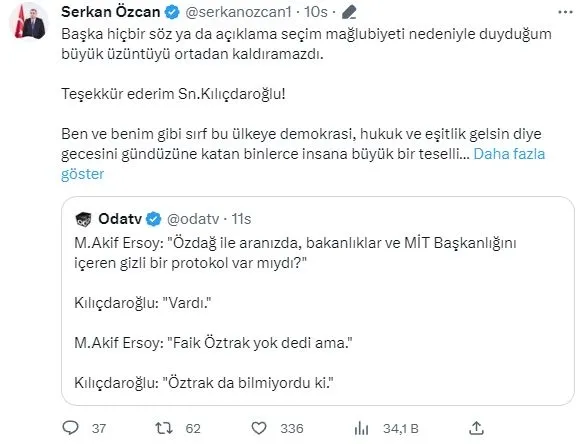 Kendi adıma, geride bıraktığımız seçimlerde Kemal Kılıçdaroğlu'nun adaylığına engel olamadığım için milletimizden samimi olarak özür diliyorum. Ve bu özrü, sadece seçimleri kaybettiğimiz için değil aynı zamanda Kemal Kılıçdaroğlu'nun adaylığı elde etmek ve seçimleri kazanmak için kullandığı yöntemlerle yeteri kadar mücadele edemediğim için diliyorum. Seçim kampanyasını popülizme indirgeyen, eleştirdiği kişiye dönüşen ve sahici politikalar üretemeyen bir isim/ekip Türkiye'nin kaderini belirlememeliydi.