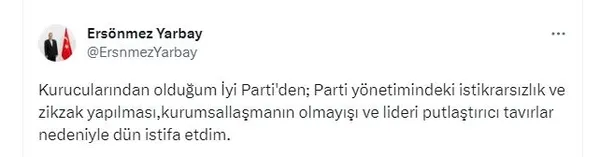 Yeni bir siyaset kültürüne ihtiyaç var dedik. Birçok proje sunduk Genel Merkeze, kabul görmedi. Ben İYİ Parti'de siyaset yapamayacağımı anladım. 'Kaybedilecek bir kavganın sebebi biz olmayalım' dedik. İstifa ediyorum."