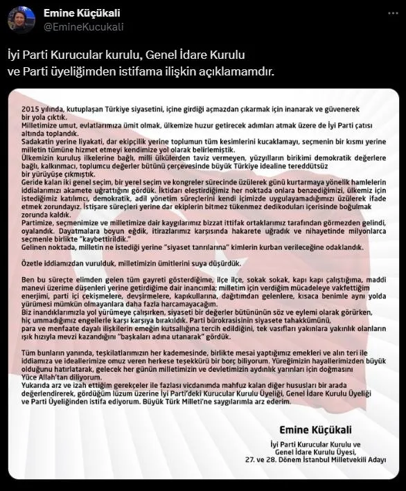 İyi Parti Kurucular Kurulu Üyesi Emine Küçükali de partiden istifa ettiğini açıkladı. Küçükali, sosyal medyadan yaptığı açıklamada, "Genel İdare Kurulu ve Parti üyeliğimden istifama ilişkin açıklamamdır." ifadelerine yer verdi.