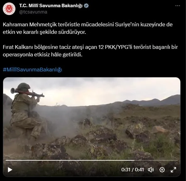 Milli Savunma Bakanlığı, Fırat Kalkanı bölgesinde taciz ateşi açan 12 PKK/YPG'li teröristin etkisiz hale getirildiğini açıkladı.