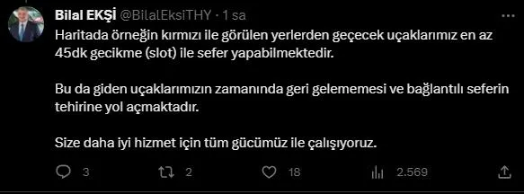 "2022 yılından itibaren Avrupa ülkelerindeki hava sahası kapasite problemleri ve yol boyu gecikmeleri maalesef devam ediyor. Haritada örneğin kırmızı ile görülen yerlerden geçecek uçaklarımız en az 45 dakika gecikme (slot) ile sefer yapabilmektedir. Bu da giden uçaklarımızın zamanında geri gelememesi ve bağlantılı seferin tehirine yol açmaktadır. Size daha iyi hizmet için tüm gücümüz ile çalışıyoruz."