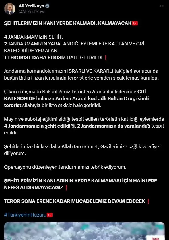 Yerlikaya, sosyal medya hesabından yaptığı açıklamada, jandarma komando birliklerinin kararlı takibi sonucu bugün Bitlis'in Hizan ilçesi kırsalında teröristlerle sıcak temas kurulduğunu belirtti.