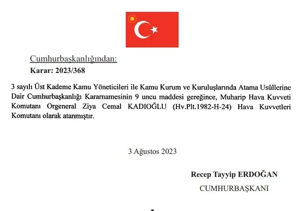 Başkan Erdoğan'ın onayıyla alınan kararlar doğrultusunda, 30 Ağustos'tan geçerli olarak, Kara Kuvvetleri Komutanlığı'nda Tümgeneral Ömer Ertuğrul Erbakan ve Ahmet Kurumahmut, Tuğgeneral Şefik Atak, Nihat Ergün, Mustafa Köksal, Ferat Vural, Mustafa Cüneyt Arıkan, Ahmet Gülmüş, Berat Acar, Salih Büyük, Osman Akyıldız, Hacı Halil Osma, Halil Ünver ve Mehmet Zeki Eren, Deniz Kuvvetleri Komutanlığı'nda Tuğamiral Recep Erdinç Yetkin, Serhat Sözbir, Ercan Kireçtepe ve Mehmet Emre Sezenler, Hava Kuvvetleri Komutanlığı'nda ise Tümgeneral Göksel Kahya ve Selçuk Aygün, Tuğgeneral Gürhan Ergürhan, Sadık Uygur, Ali Öztürk ve Ender Kartal'ın görev süresi 1 yıl uzatıldı.