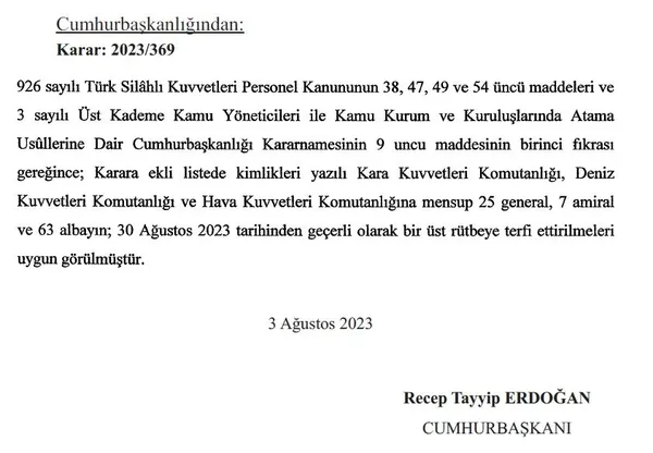 Başkan Erdoğan tarafından onaylanan kararlar kapsamında, 30 Ağustos'tan geçerli olmak üzere 32 general ve amiral bir üst rütbeye, 63 albay ise general ve amiralliğe terfi ettirildi.