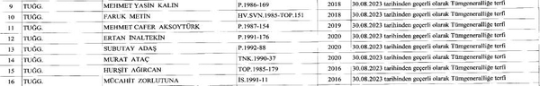 Cumhurbaşkanlığının internet sitesinde yayımlanan listeye göre, bir üst rütbeye yükseltilen general/amiral ve albaylar şöyle sıralandı: