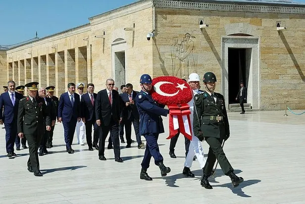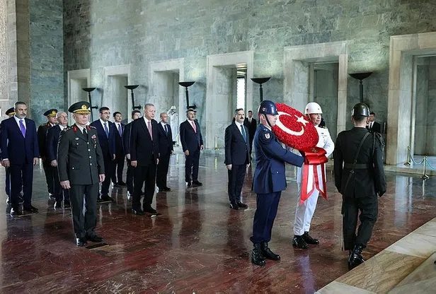 Başkan Erdoğan'ın ay yıldız motifli çelengi Atatürk'ün mozolesine bırakmasının ardından saygı duruşunda bulunuldu, İstiklal Marşı okundu.