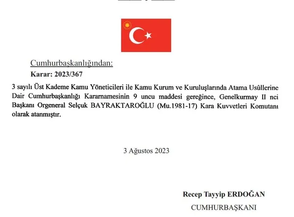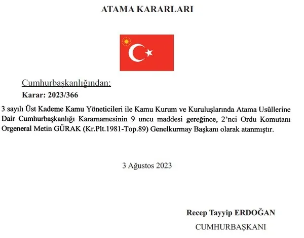 Genelkurmay Başkanlığına 2'nci Ordu Komutanı Orgeneral Metin Gürak, Kara Kuvvetleri Komutanlığına Genelkurmay 2'nci Başkanı Orgeneral Selçuk Bayraktaroğlu, Hava Kuvvetleri Komutanlığına Muharip Hava Kuvvetleri Komutanı Orgeneral Ziya Cemal Kadıoğlu atandı.