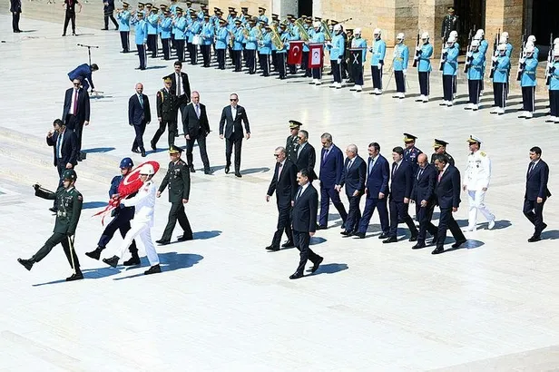 Erdoğan'ın Aslanlı Yol'un başındaki yerini almasının ardından başlayan törene, Cumhurbaşkanı Yardımcısı Cevdet Yılmaz, Adalet Bakanı Yılmaz Tunç, Dışişleri Bakanı Hakan Fidan, Hazine ve Maliye Bakanı Mehmet Şimşek, İçişleri Bakanı Ali Yerlikaya, Milli Eğitim Bakanı Yusuf Tekin, Milli Savunma Bakanı Yaşar Güler, Genelkurmay Başkanı olarak görevlendirilen Kara Kuvvetleri Komutanı Orgeneral Musa Avsever, Deniz Kuvvetleri Komutanı Oramiral Ercüment Tatlıoğlu ve Hava Kuvvetleri Komutanı Orgeneral Atilla Gülan katıldı.