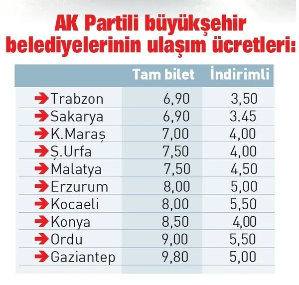 3 milyar bütçesi bulunan Trabzon ve 4 milyar bütçesi bulunan Sakarya Büyükşehir Belediyeleri ise ulaşım hizmetini 6,90 TL'den veriyor.